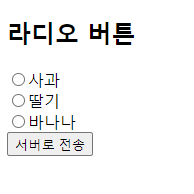<label><input type="radio" name="fruit" value="apple">사과</label><br>