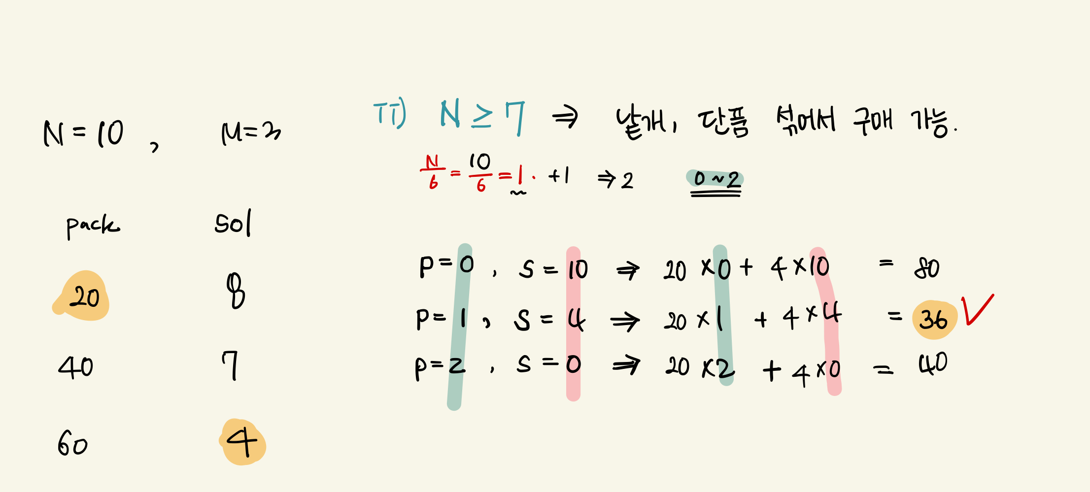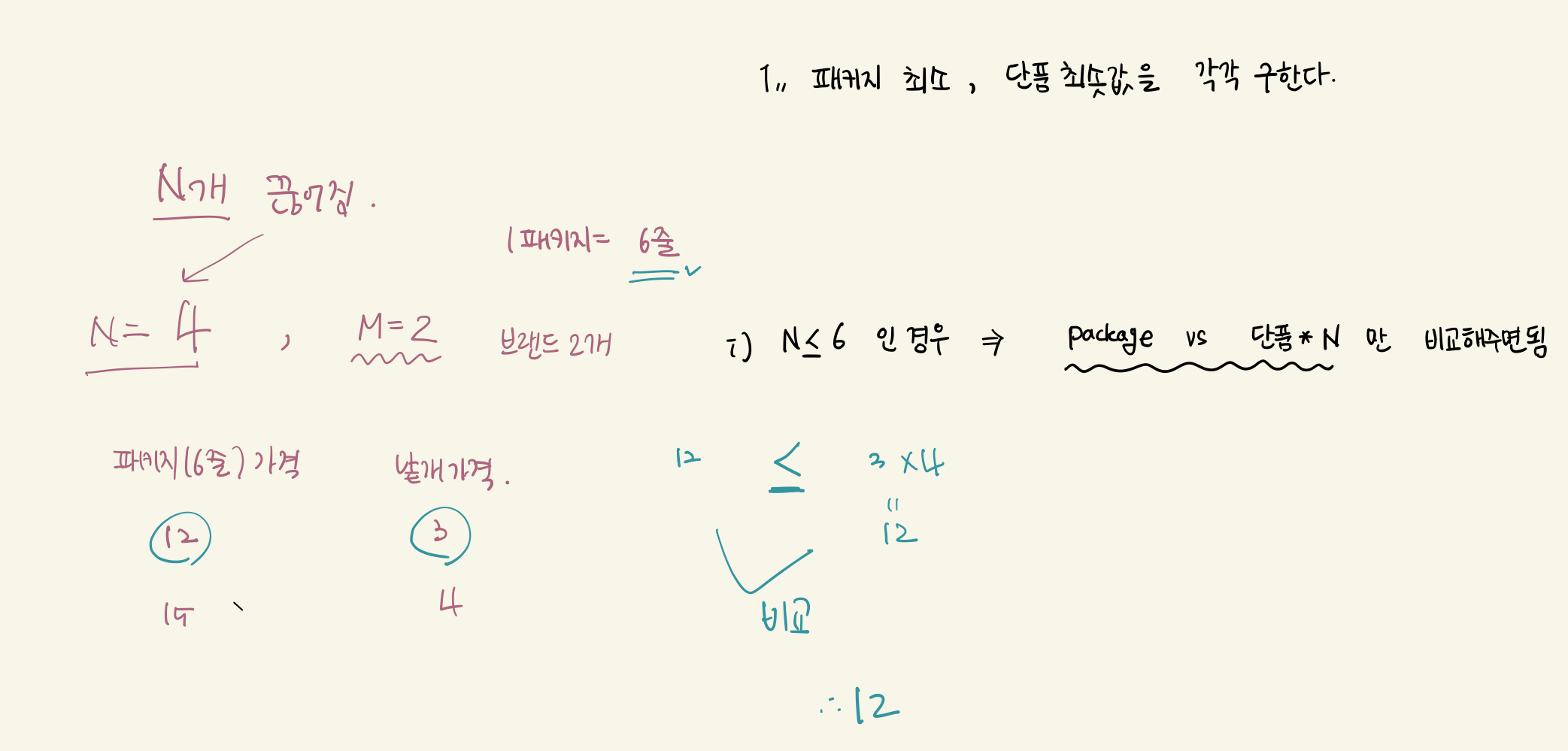 첫째 줄에 N과 M이 주어진다. N은 100보다 작거나 같은 자연수이고, M은 50보다 작거나 같은 자연수이다. 둘째 줄부터 M개의 줄에는 각 브랜드의 패키지 가격과 낱개의 가격이 공백으로 구분하여 주