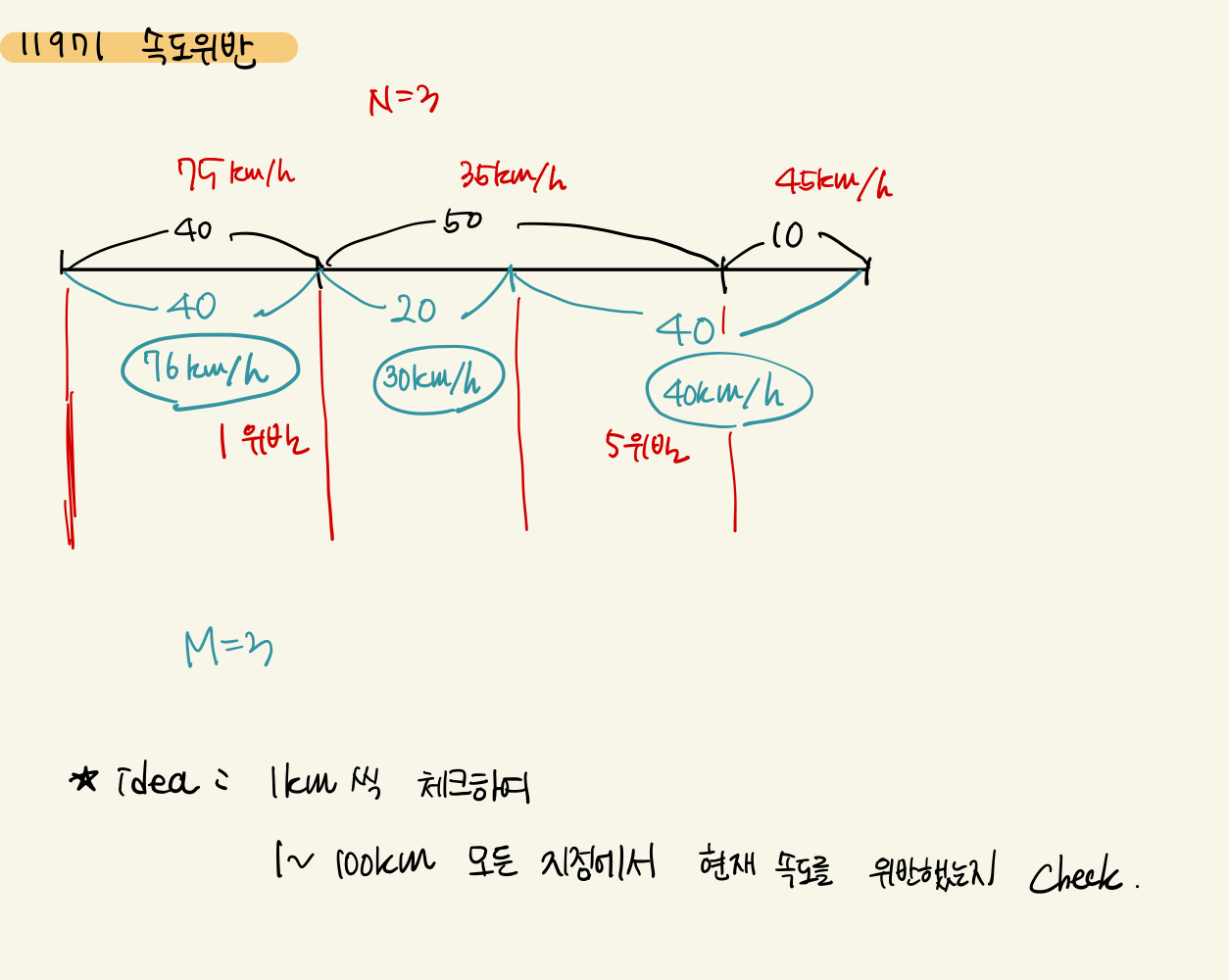 예를 들어 도로가 3구역 [(40km, 75km/h), (50km, 35km/h), (10km, 45km/h)] 이고. 연정이가 달린 3구역 [(40km, 76km/h), (20km, 30km/h), (40km, 40km/h)] 이라면, 처음 0 ~ 40km 영역에서 1km/h 만큼 위반했으나 60km ~ 90km 사이에