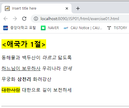 💀 ex01. 문단태그와 텍스트 태그 등으로 애국가 1절을 웹브라우저에 출력하기