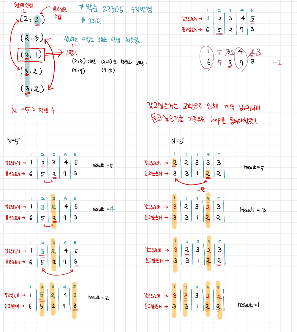 $2$번 학생과 $3$번 학생이 수업을 교환한 후, $3$번 학생이 교환한 수업을 $5$번 학생과 교환하게 되면 $2$/$3$/$5$ 번 학생이 원하는 수업을 수강할 수 있다.