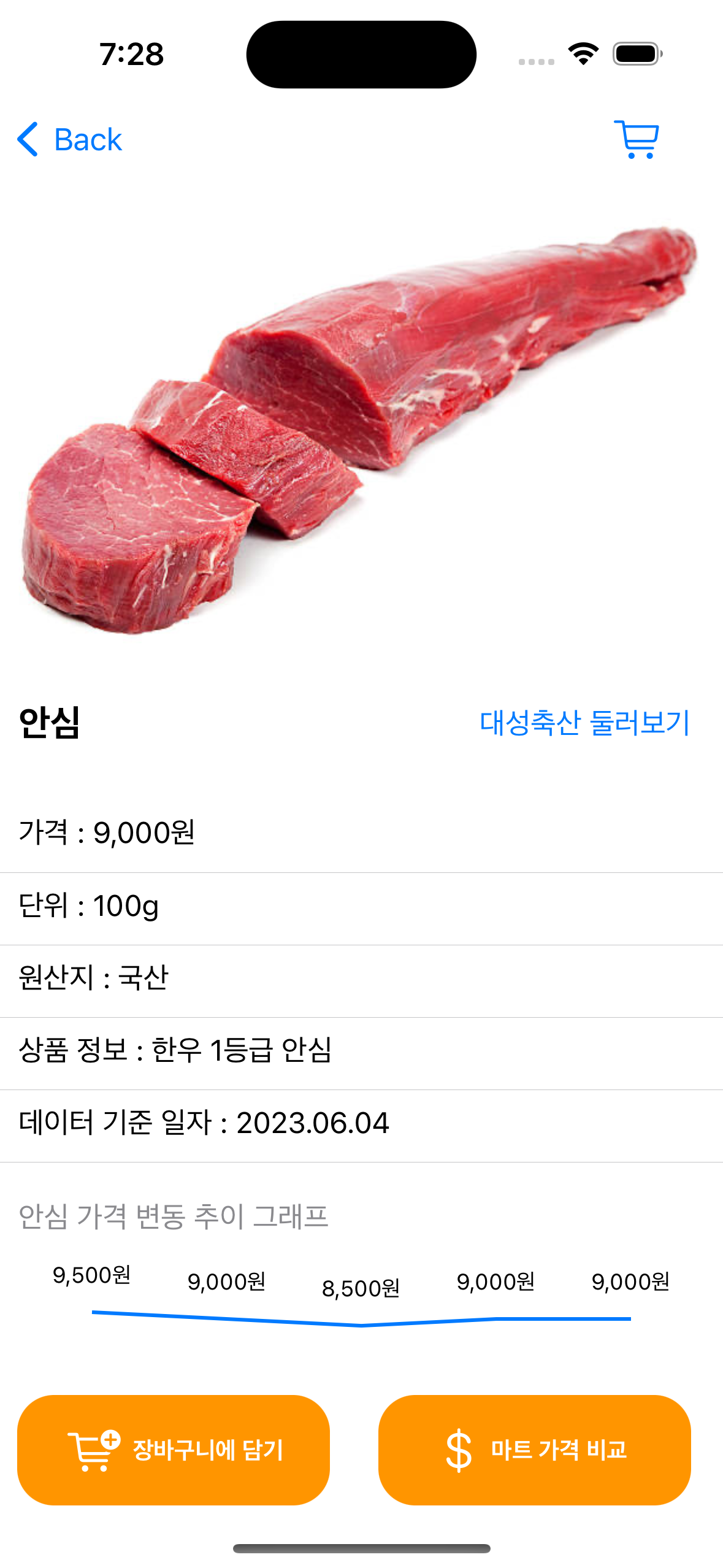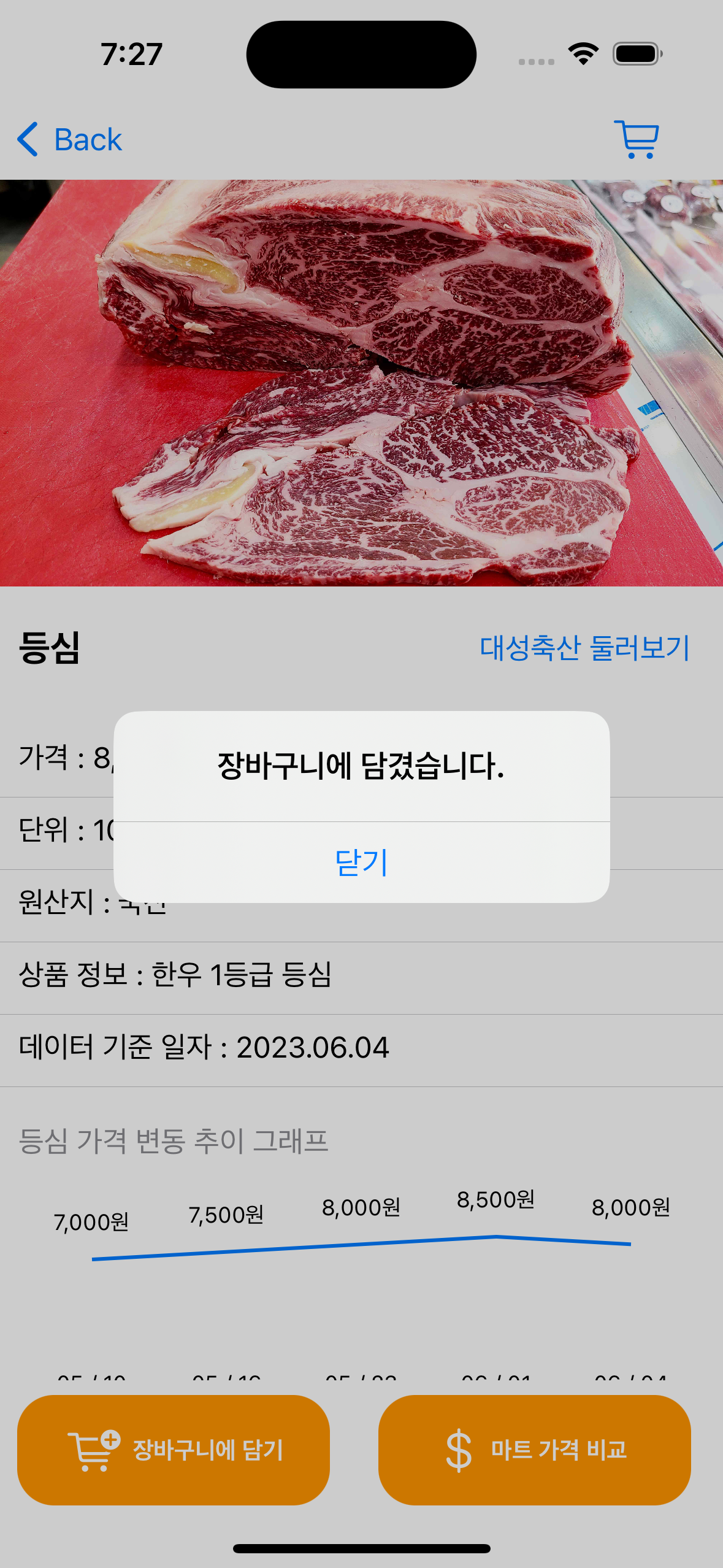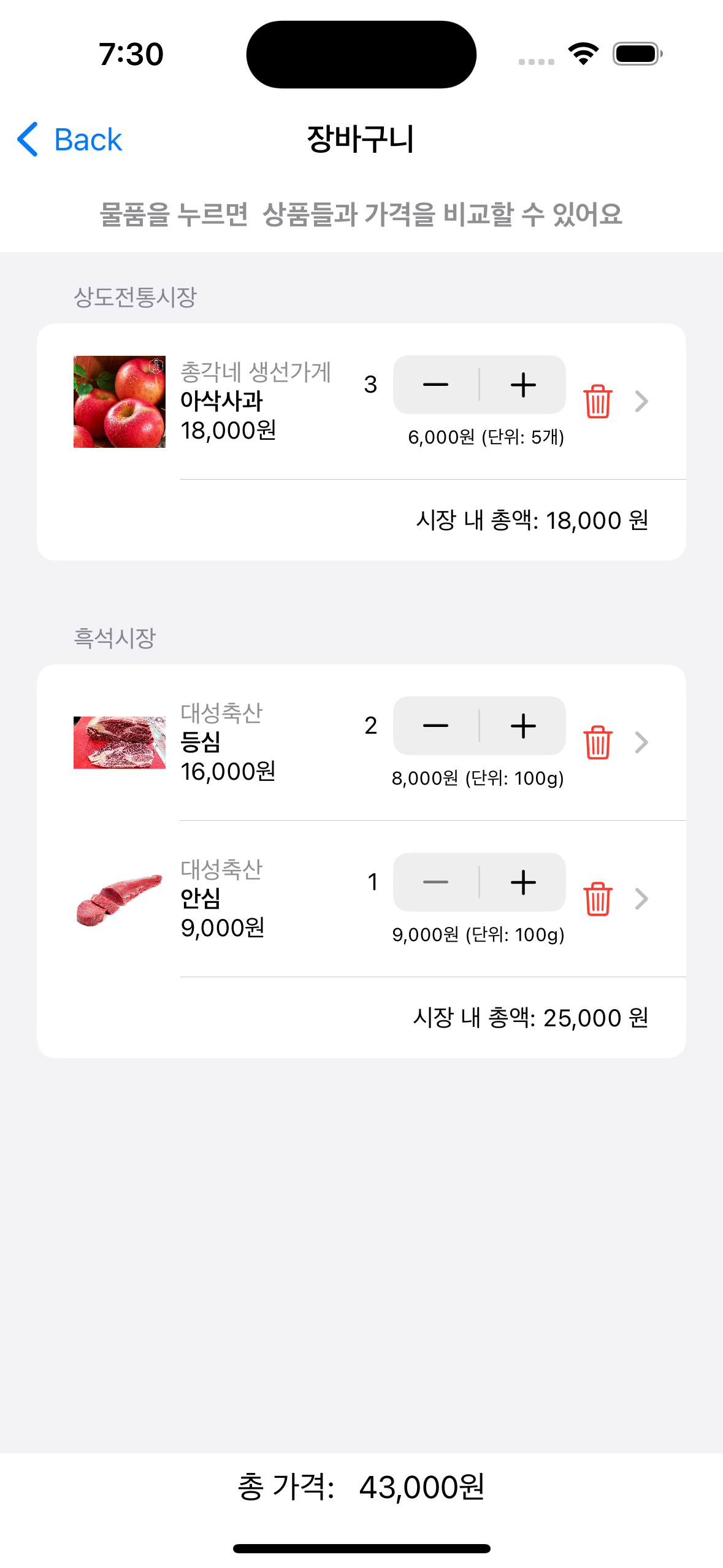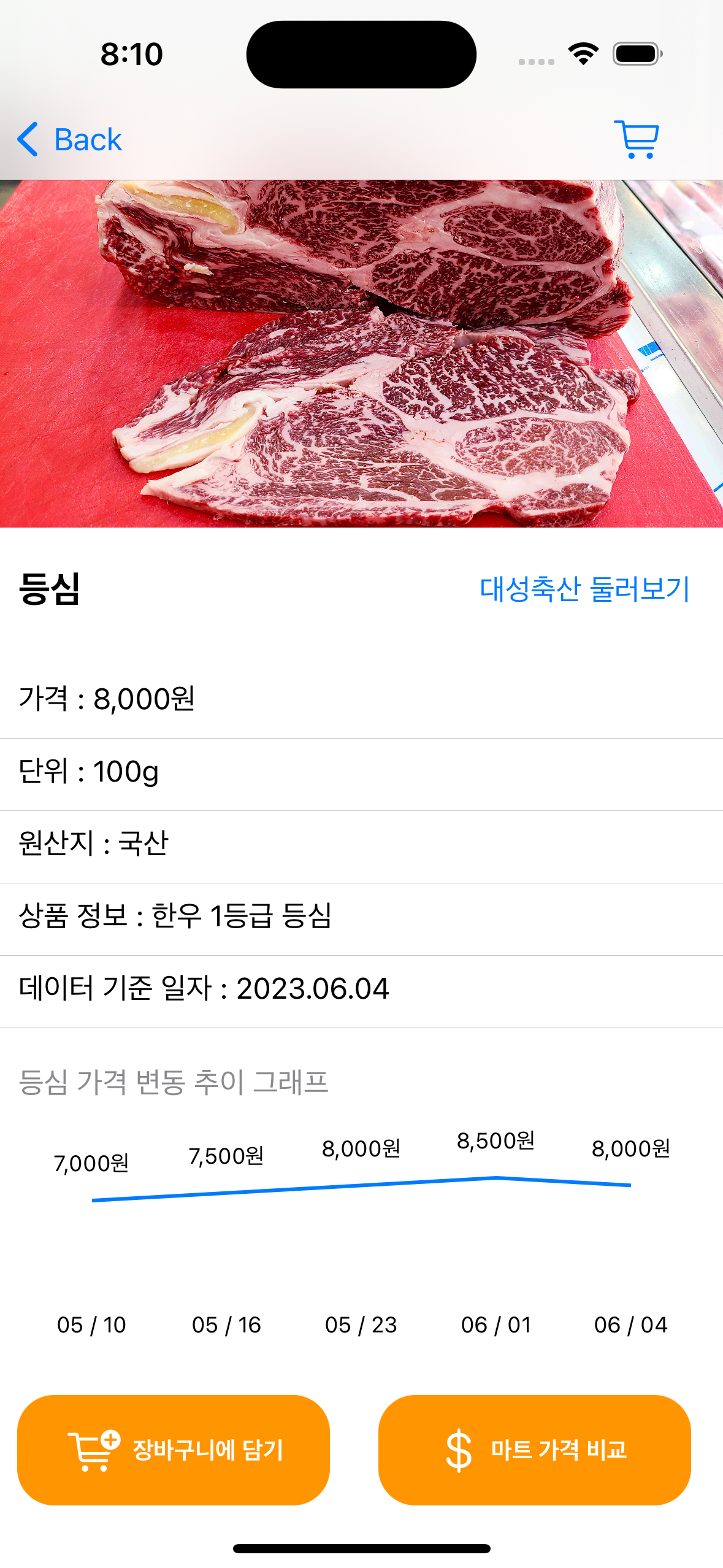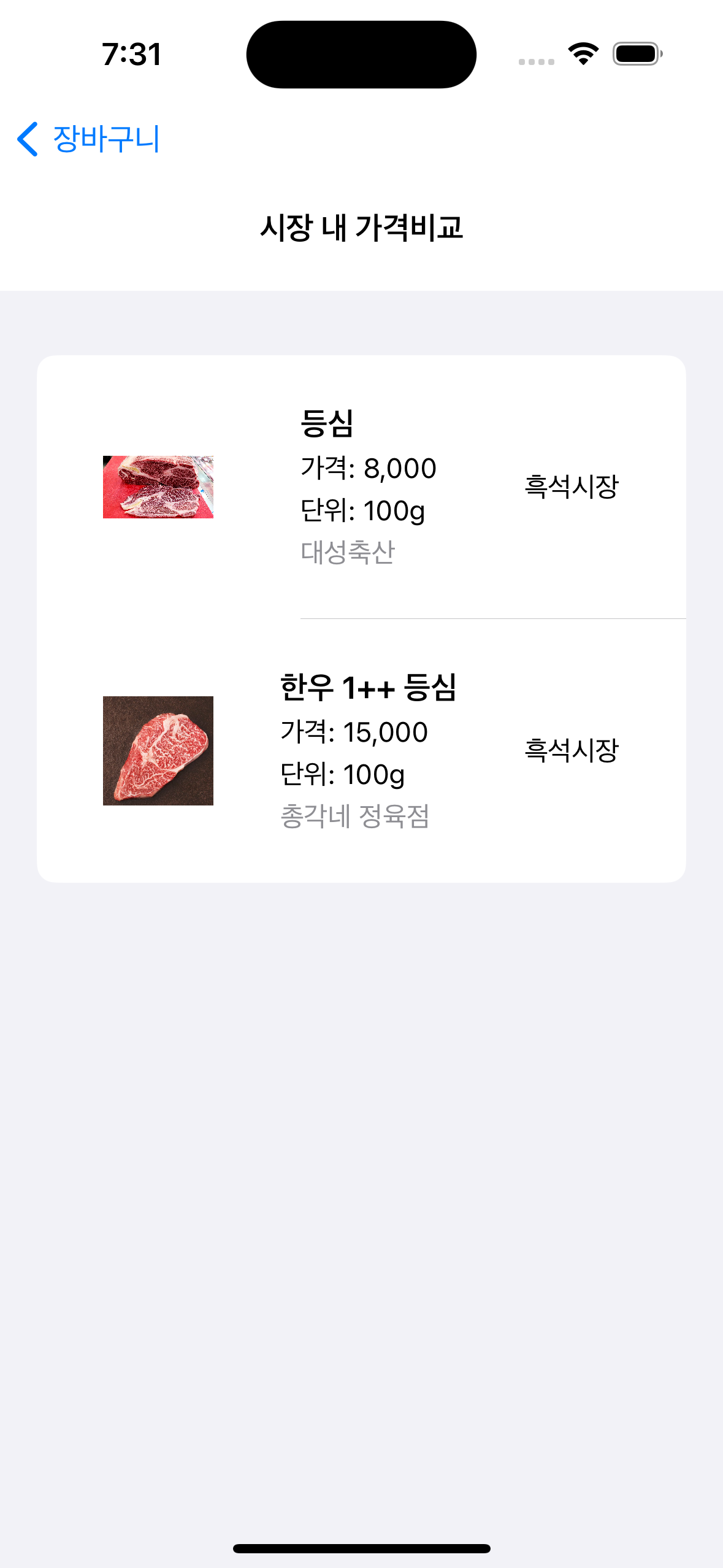 시장에 있는 상품들과의 가격비교를 위해 상품 이름을 넣으면 상품 정보들이 불러와지도록 구현하는 부분이다.