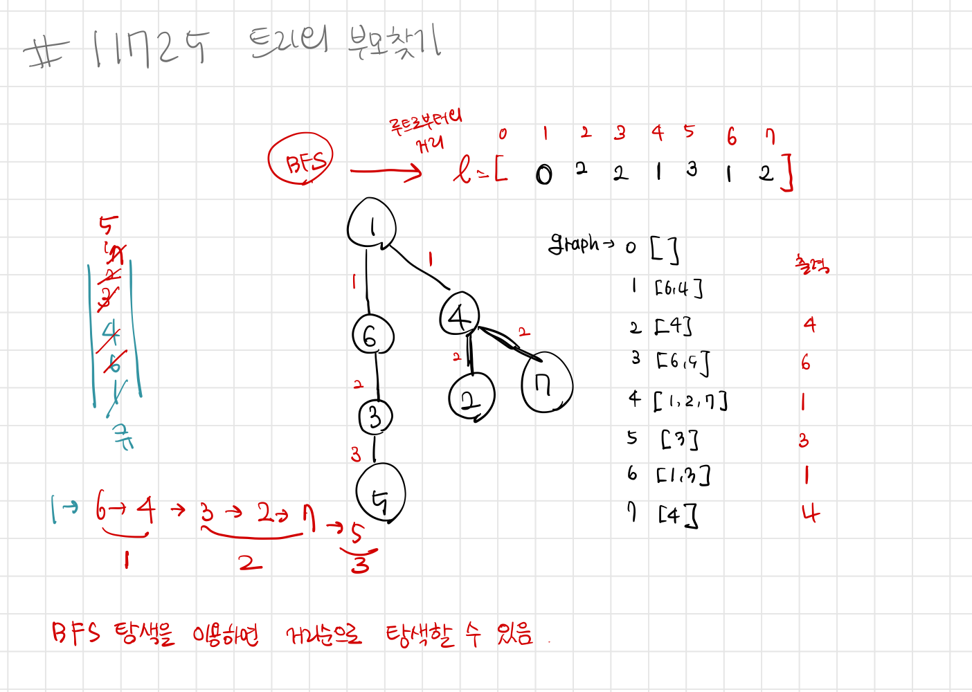 루트 없는 트리가 주어진다. 이때, 트리의 루트를 1이라고 정했을 때, 각 노드의 부모를 구하는 프로그램을 작성하시오.