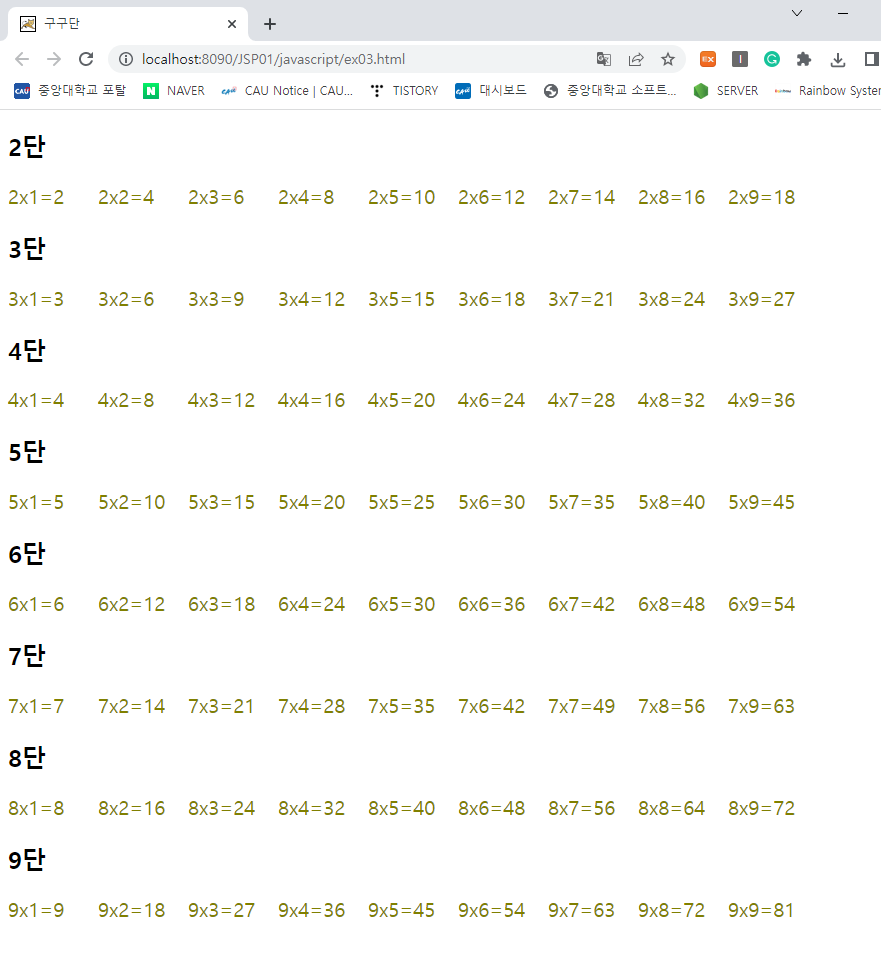 ✍️2. 이중 for문과 document.write()를 사용해서 웹브라우저에 2~9단까지 구구단 출력하기