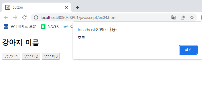 <button onclick="javascript: alert('초코')">댕댕이1</button>