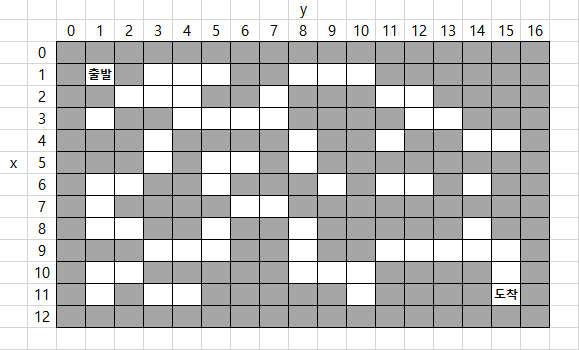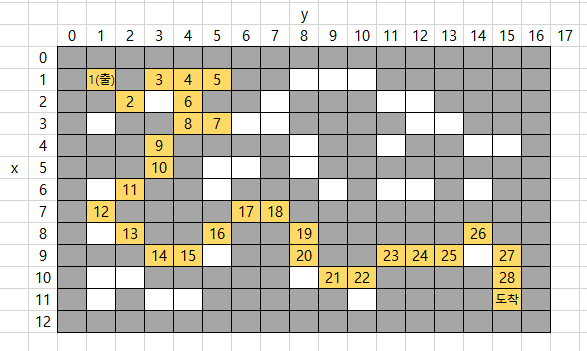 - 이미 방문한 위치를 표시하기 위해 새로운 배열 mark[13][17]을 만들어준다. (방문한 위치:1, 아직 방문하지 않은 위치:0)