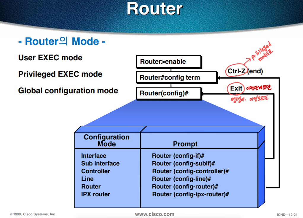 - User mode에서 'enable' 명령어를 사용하면 Privileged mode로 들어온다.