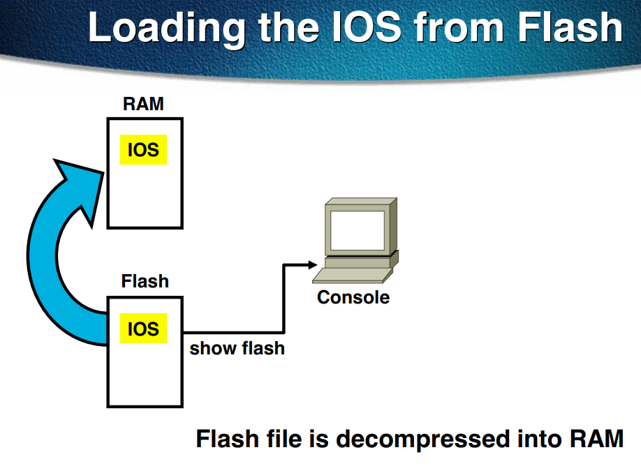 - IOS가 올라와서 실행되고, Routing table과 구성파일(설정내용)이 올라와서 동작하는 장소