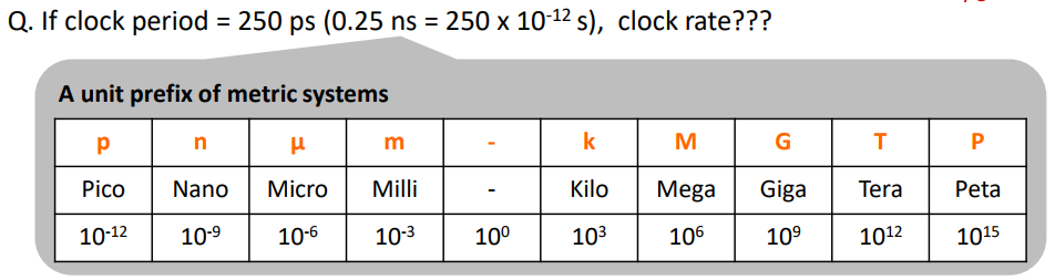 예를들어 4.0 GHz의 Clock rate를 갖는다면 이는 4000 MHz이며 4.0 * 10^9Hz이므로 4*10^9 cycle/sec을 갖는다.