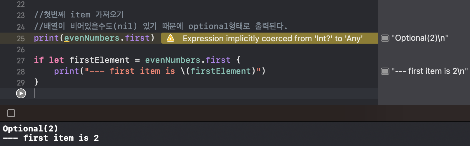 배열이 비어있을수도(nil) 있기 때문에 optional형태로 출력된다.