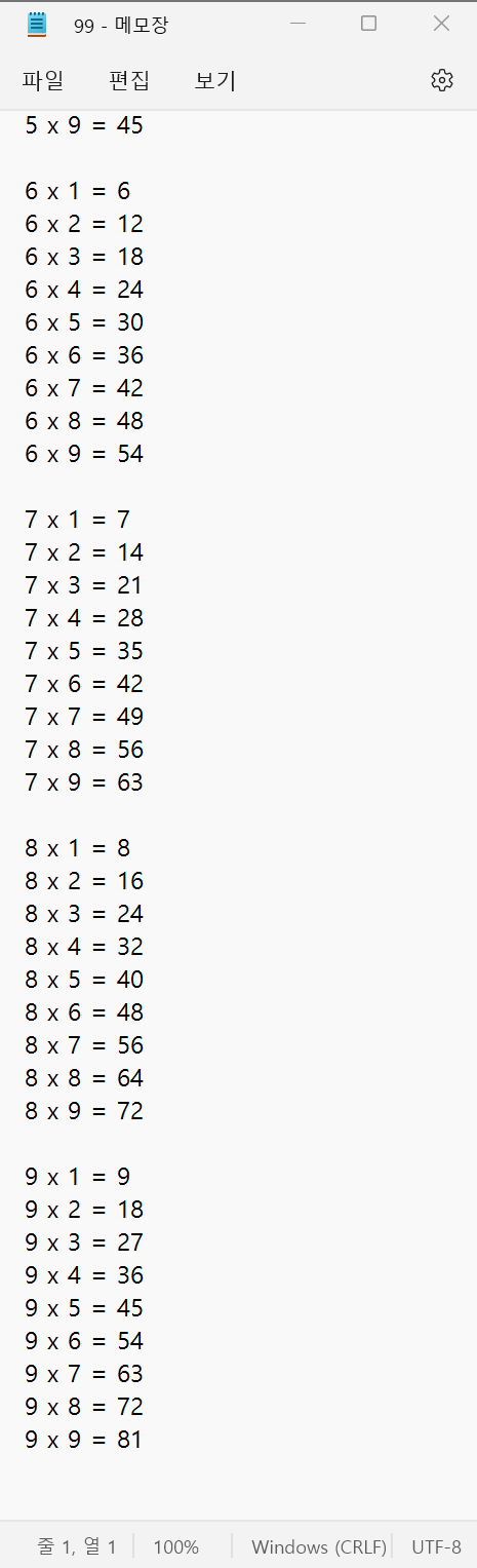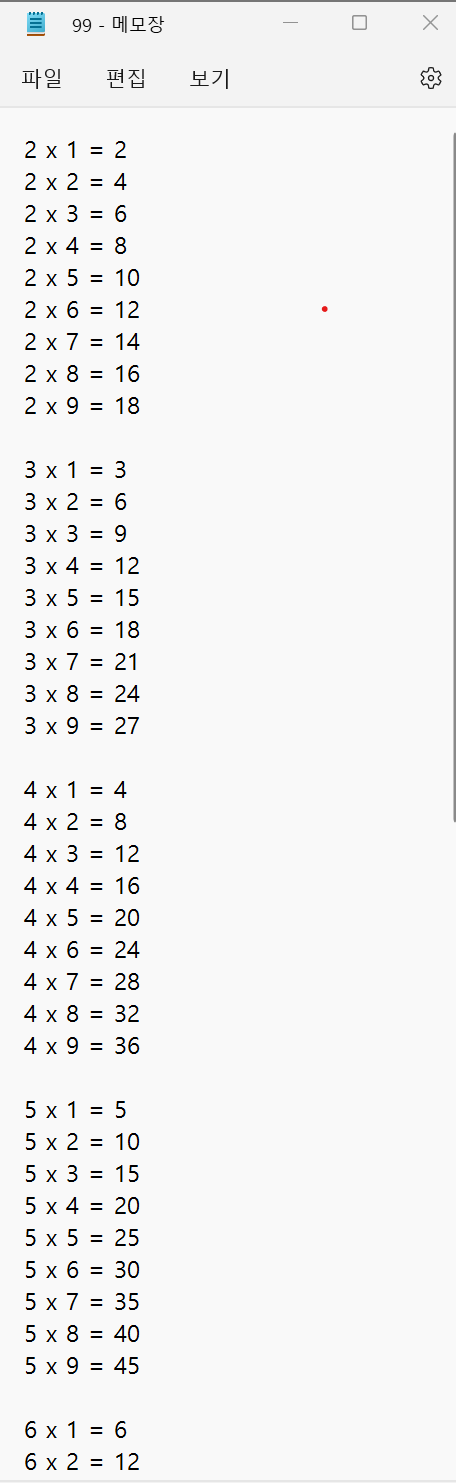 1. 프로그램상에서 파일 99.txt를 만들어서 구구단을 저장하는 프로그램을 작성하세요. 2단 ~ 9단